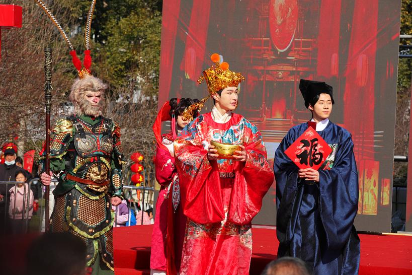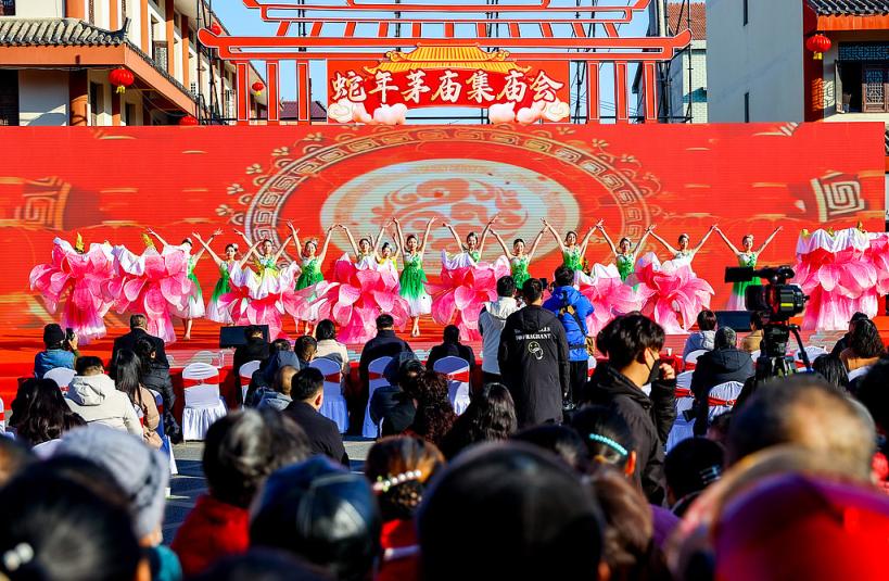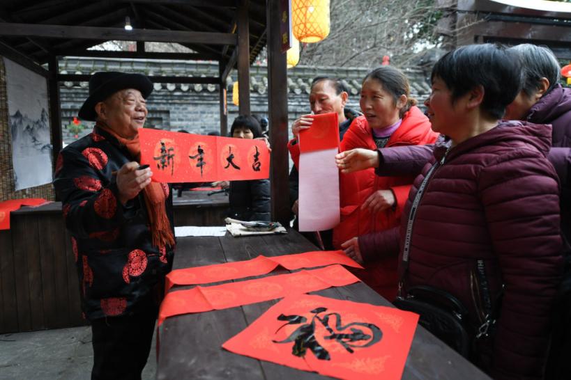 2025年1月10日,武汉,柏泉茅庙集庙会开展风俗演艺、非遗本领、送对子等多项行径。