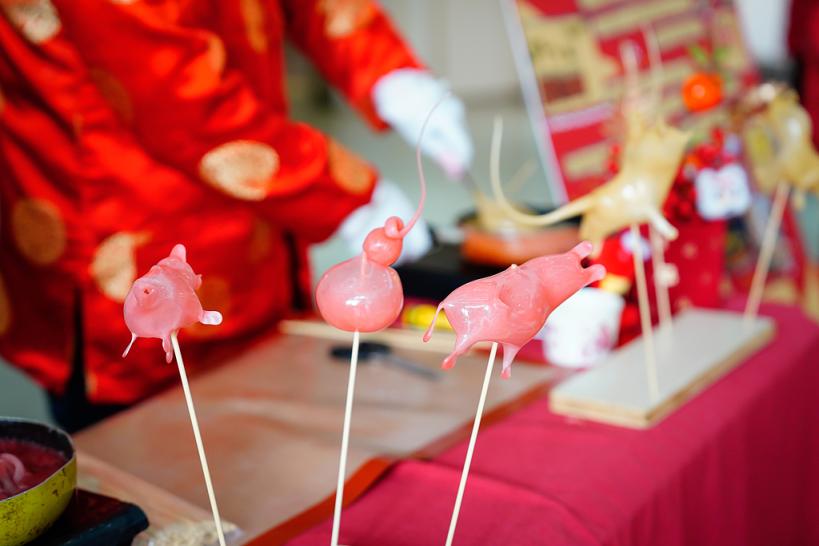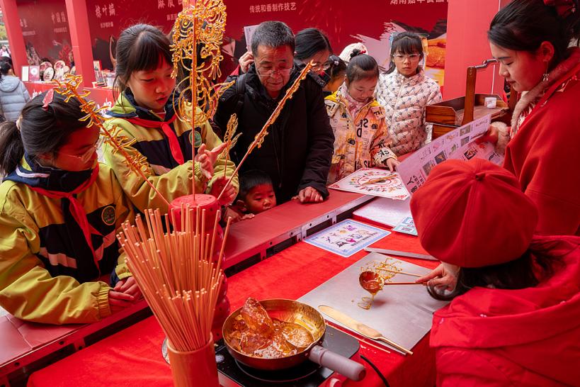 2025年1月7日,湖南长沙,近百个非遗相貌、200名非遗传承东谈主“摆摊”式样亮相迎新春嘉年华行径,图为糖画。