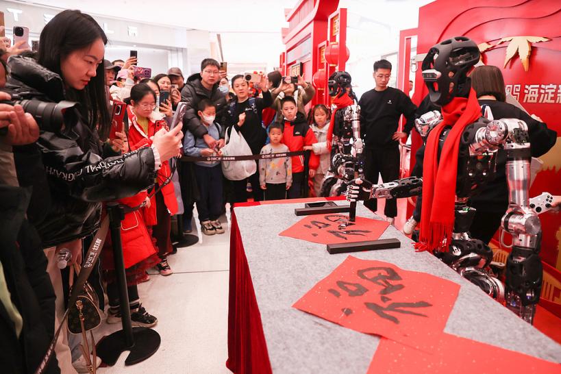 2025年1月30日,北京,不雅众在海淀新春科技庙会上不雅看机器东谈主写“福”字。