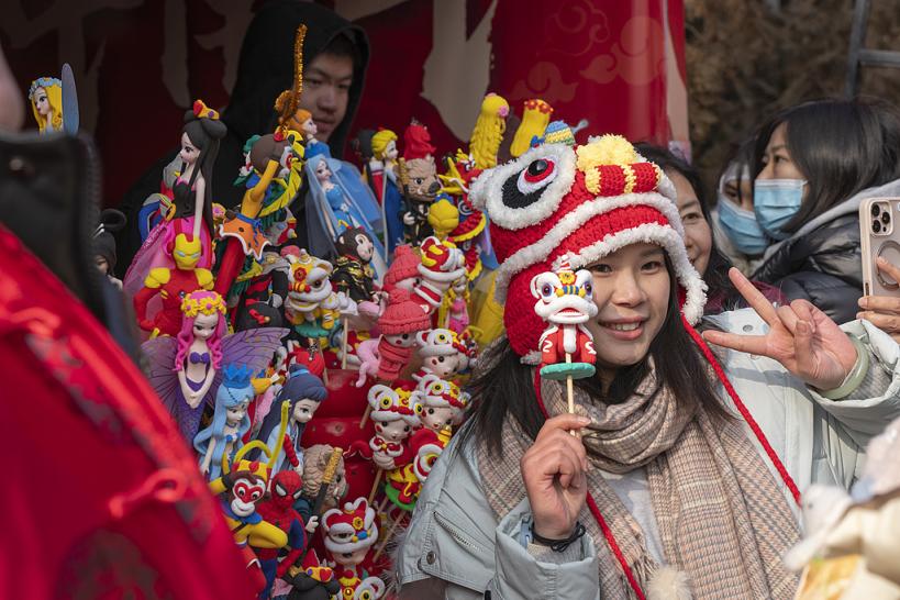 2025年1月30日,北京,东谈主们在地坛春节文化庙会上购买驰念品。