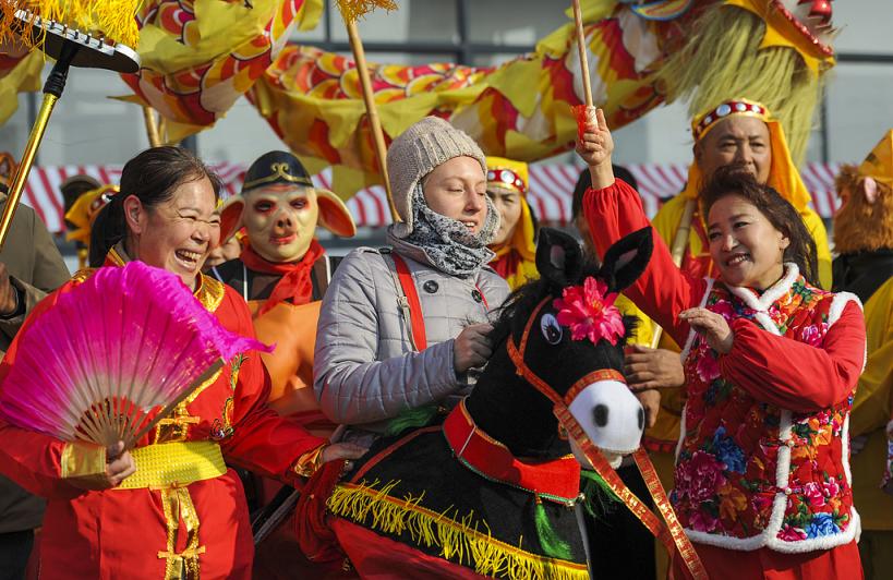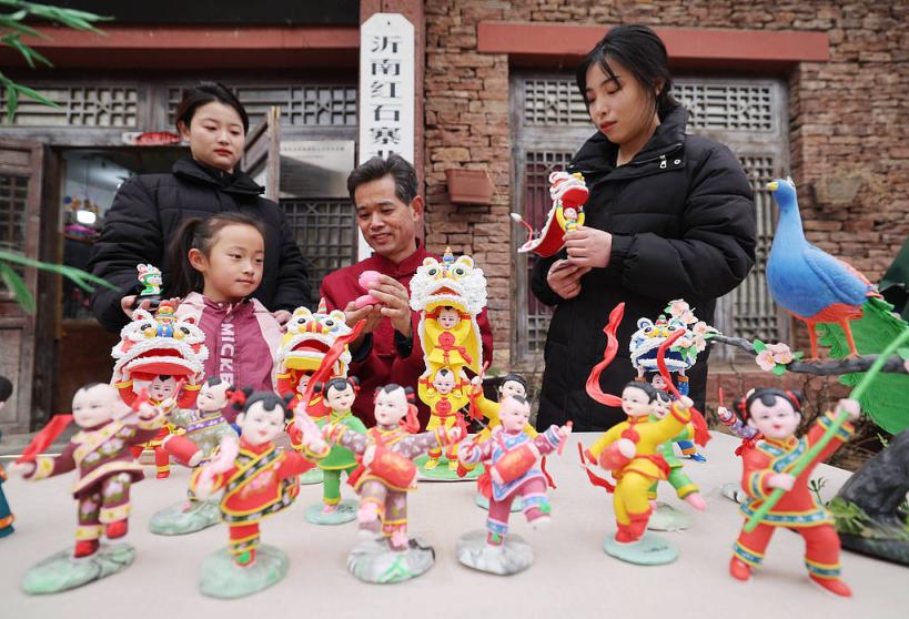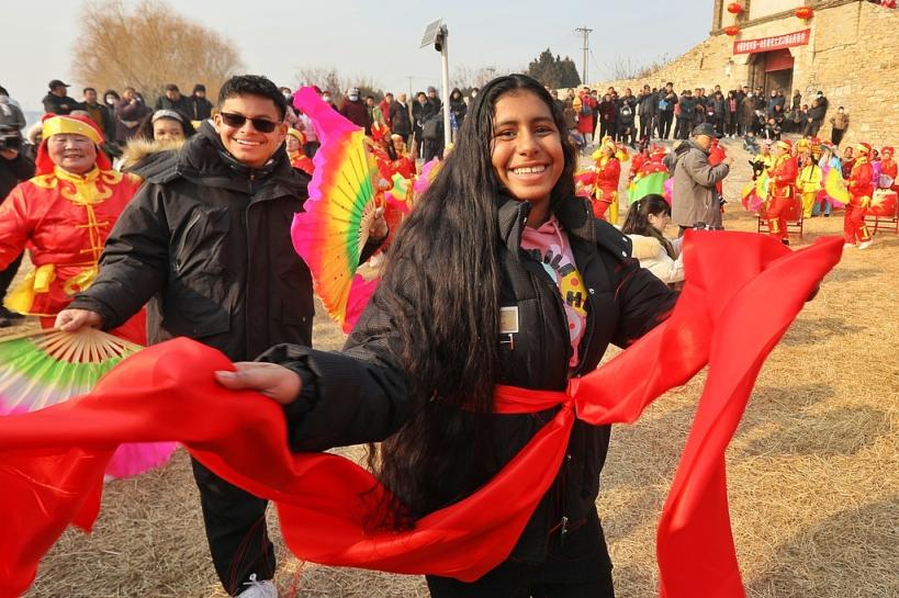 2025年1月21日,山东省枣庄市,薛城区陶庄镇鲁桥村举办首届春节风俗文化节,留学生应邀体验中国传统文化。