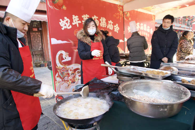2025年1月10日,武汉,庙会集市商家现场炸肉圆。