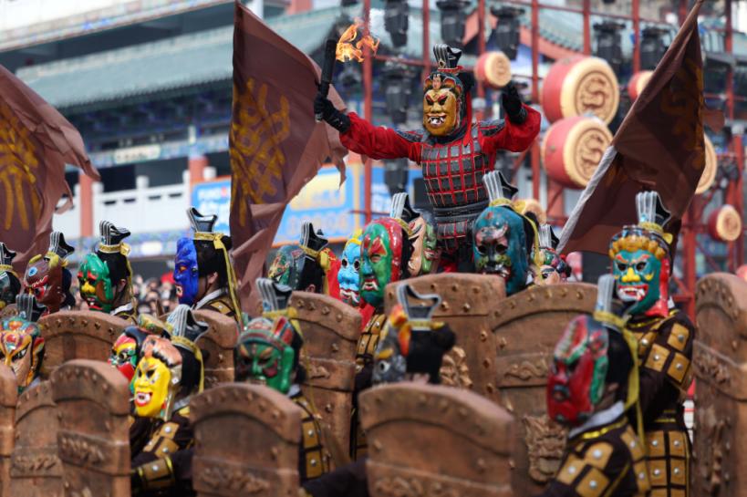 1月30日,演员在兰州市2025年春节文化庙会行径现场扮演西固军傩舞。 庙会时代,兰州太平饱读、西固军傩舞、舞龙舞狮、踩高跷、秦腔折子戏等上百场非遗凮气文化行径为市民和搭客奉上年味浓浓的文化大餐。