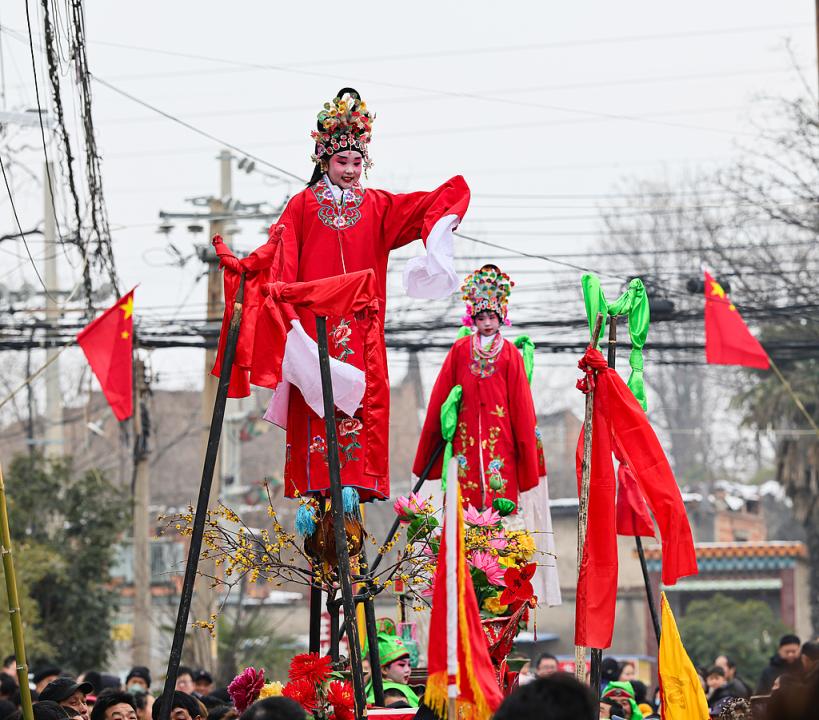 2025年2月2日,河南洛阳偃师区东蔡庄村传统的庙会上的社火高台芯子扮演。