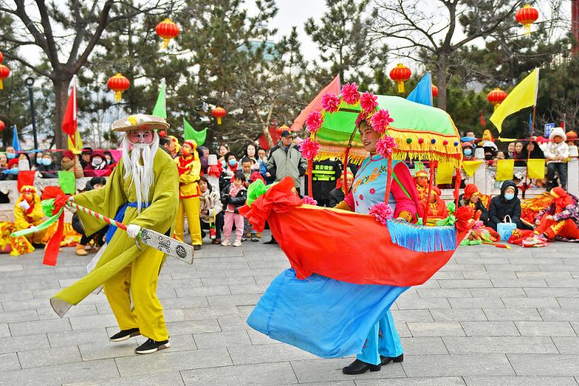 2025年2月2日,民间艺东谈主在山东省烟台市芝罘区毓璜顶庙会上扮演风俗节目划旱船。
