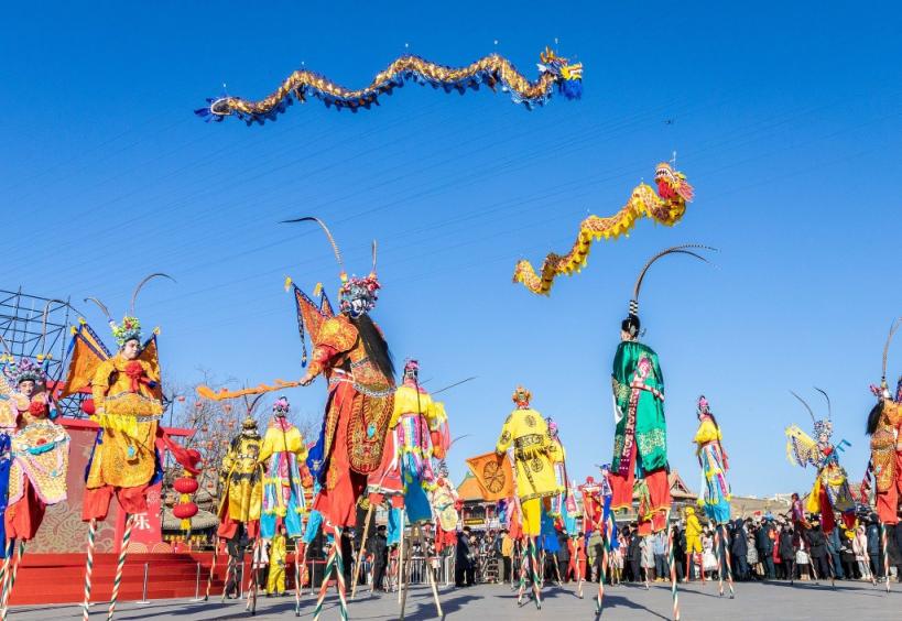 2025年2月3日,内蒙古呼和浩特,新春文化庙会行径现场,民间艺东谈主在扮演高跷。