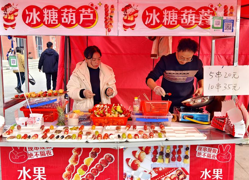 2025年1月21日,湖北黄冈,红安·万星里外广场,新春庙会的好意思食市集,红红火火地营造出浓浓的年味。