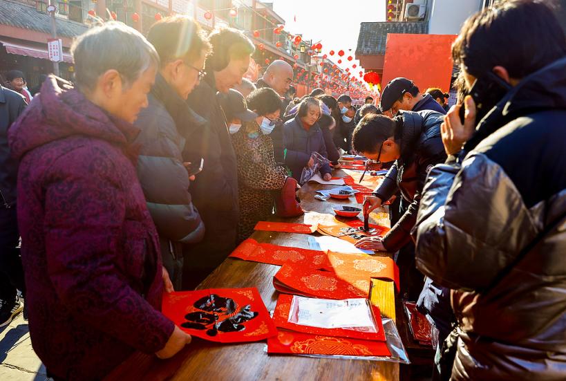 2025年1月10日,武汉,柏泉茅庙集庙会上,东谈主们写对子。