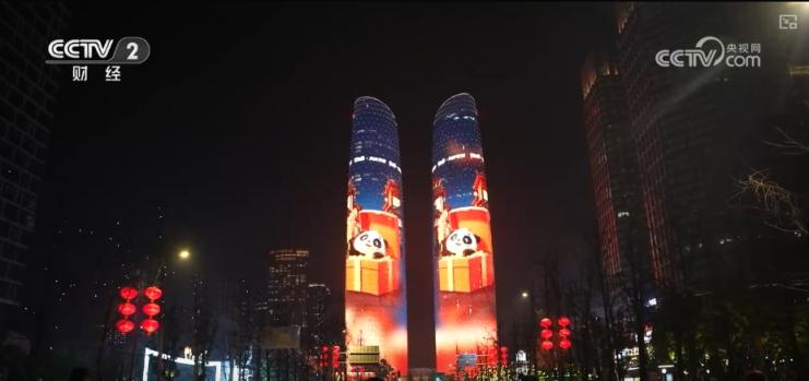 夜幕来临,52000往时米的天府双塔巨幕上,赓续呈现出寓意齐备祯祥的红灯笼、对联十二生肖福运开、百花皆放等年味满满的光影秀,为春节注入更多祈望与活力。